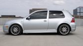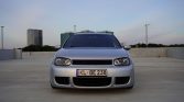 The car is finished in Reflex Silver and features R32-specific bumper covers and side skirts as well as aftermarket LED headlights, integrated fog lights, blue LED puddle lamps, a sunroof, a short antenna, and a hatch-mounted spoiler. The front and rear Volkswagen badges have been removed, and aftermarket tint film was applied to the rear and side windows.