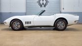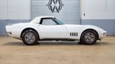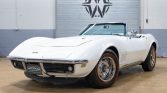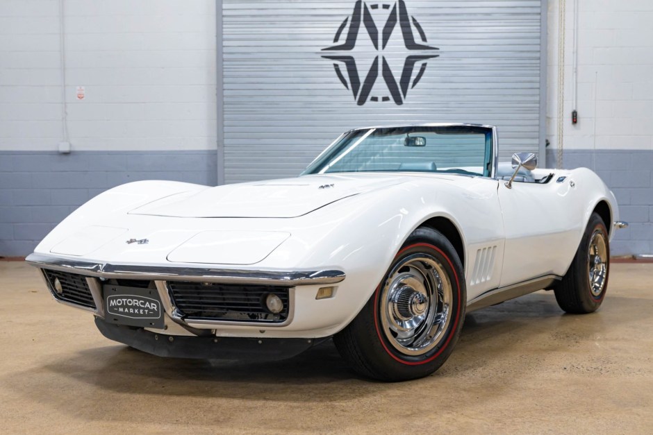 This 1968 Chevrolet Corvette convertible is powered by a 427ci V8 paired with a three-speed automatic transmission and is refinished in white over Gunmetal vinyl upholstery, and equipment includes a white convertible soft top, retractable headlights, 15″ Rally wheels, power-assisted four-wheel disc brakes, an AM/FM radio, dual exhaust outlets, and a cabin heater.