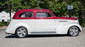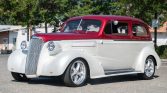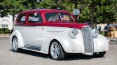 This 1937 Chevrolet Sedan street rod was refurbished and modified under previous ownership and is powered by a 383ci Chevrolet V8 equipped with an Edelbrock four-barrel carburetor, an electronic ignition, and a 3″ dual exhaust system with ceramic-coated headers. The car is finished in red and white and is also equipped with a four-speed automatic transmission, independent front suspension, rack-and-pinion steering, four-wheel disc brakes, 17″ Foose wheels, and a 10-bolt rear end. The interior is upholstered in red,…