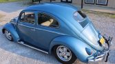 This 1956 Volkswagen Beetle is finished in Eismeer Blue Metallic over a two-tone gray interior and powered by a 2,387cc flat-four paired with a four-speed manual transmission. The car was acquired by the seller in 2007 and subsequently refurbished with work including a body-off repaint, refreshing the interior, and installation of a custom sound system with a Pioneer Bluetooth stereo, Porsche-style Fuchs wheels, a Porsche fan conversion, four-wheel disc brakes, a dual-outlet exhaust, and ISP instrumentation. Equipment…