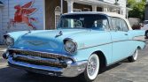 This 1957 Chevrolet Bel Air two-door convertible is finished in blue over a coordinated two-tone interior and is powered by a 283ci V8 paired with a two-speed Powerglide automatic transmission. The car was refurbished at some point under prior ownership and is equipped with a power-operated white soft top, a blue top boot, 14″ steel wheels, power steering, a split-folding front bench seat, and a push-button radio.