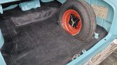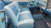 The cabin features a split-folding front bench seat trimmed in two-tone blue upholstery that extends to the rear bench and door panels. Interior appointments include a push-button AM/FM radio, locking glovebox, analog clock, and vent windows.