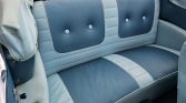 The car left the factory finished in Larkspur Blue and was refinished as part of a refurbishment under prior ownership. It has a power-operated white soft top, hooded headlights, twin wind splits, a fuel filler concealed above the left taillight, and chrome bumpers.