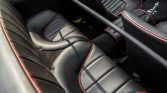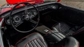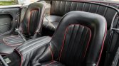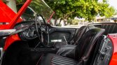 The cabin features black bucket seats with red piping as well as a matching center console armrest, rear seats, carpets, and trim. The dash houses a rearview mirror, heater controls, a grab handle, and an overdrive switch. The floorboards were replaced during the refurbishment.