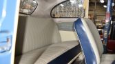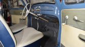 The cabin features seats upholstered in white and blue vinyl along with a blue dashboard and white and gray door panels.