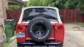 The truck is finished in red and shows signs of wear and age throughout. Features include a black-finished rear bumper, a receiver hitch, and a white soft top with tinted soft windows.