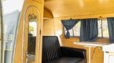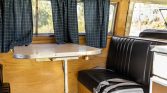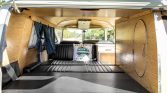 The rear of the cabin features gray carpets and wood paneling on the roof, door panels, and sides. Features include an ice chest, a fold-away table, storage cabinets, LED overhead lights, and folding bench seats trimmed in black vinyl. Wear is visible on one of the door panels. The seller notes that a coffee maker and camp-style propane stove are included in the sale.
