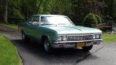 This 1966 Chevrolet Bel Air is a two-door sedan that was refurbished during previous ownership and acquired by the current owner in 2018. The body is finished in light turquoise over a black vinyl interior, and power is powered by a 454ci V8 paired with a TH400 three-speed automatic transmission. Features include front disc brakes, four-link rear suspension, an adjustable Panhard rod, bucket seats, and a dual exhaust system with Flowmaster mufflers.