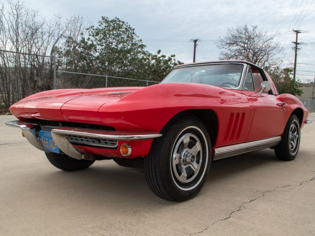 This 1966 Chevrolet Corvette convertible was modified during previous ownership in California in the 1960s, with work including enlarging the rear wheel arches and retrimming the interior with custom upholstery. Its 327ci V8 is paired with a Muncie four-speed manual transmission, and additional features include a removable hardtop, four-wheel disc brakes, and a Delco AM/FM radio.