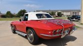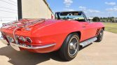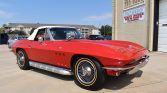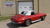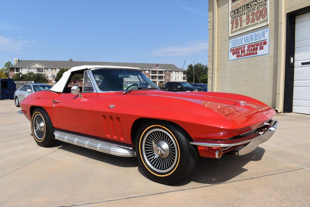 This 1966 Chevrolet Corvette convertible is powered by a 327ci V8 paired with a four-speed manual transmission and is finished in red over black vinyl. The car was refurbished circa 2014. Work in preparation for the sale involved replacing the coolant expansion tank, voltage regulator, right rear brake caliper, and hardware for the body-color removable hardtop. Equipment includes a white soft top, turbine-style wheels, four-wheel disc brakes, a rear luggage rack, a side-exit exhaust system, and a push-button radio.