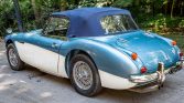 This 1967 Austin-Healey 3000 BJ8 Mk III was acquired by the seller in 1993 and was reportedly refurbished in the early 2000s by Healey Werks of Lawton, Iowa. The car is finished in blue and white over blue leather and is powered by a 2.9-liter inline-six paired with a four-speed manual transmission with overdrive. Features include chrome bumpers with overriders, 15″ knock-off wire wheels, a blue soft top, an AM radio, and a trunk-mounted Alpine stereo with…