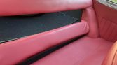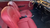 The cabin features front bucket seats and a rear bench that have been reupholstered in red leather with matching door panels and a contrasting black dashboard and carpeting. Equipment includes wood dash trim, a push-button AM/FM radio, a clock, and a glovebox. The floors are lined with rubber mats that were replaced in January 2017, and the crank for the left window was replaced in July 2020.