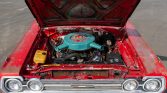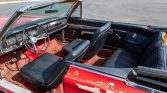 Originally finished in white, the body was repainted red under previous ownership, and the seller notes the presence of body filler. A convertible top frame and mechanism are retained, although no fabric is present. Additional features include simulated hood scoops, bright-finished trim, chrome bumpers, and dual exhaust.