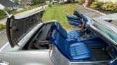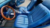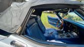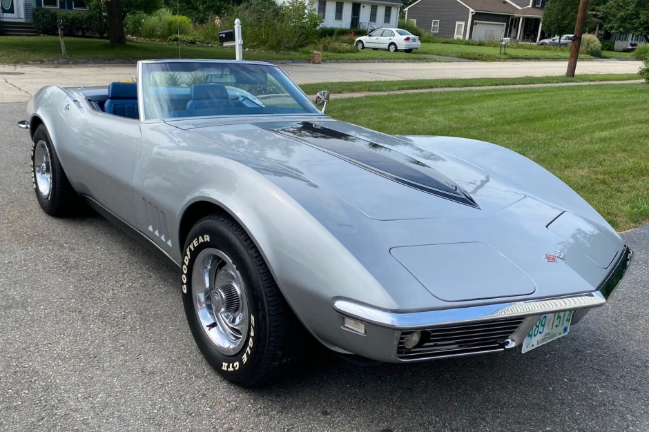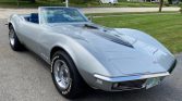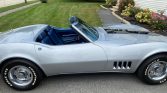 This 1968 Chevrolet Corvette convertible is finished in Silverstone Silver over blue vinyl and is powered by a 327ci V8 mated to a wide-ratio four-speed manual transmission. Equipment includes a black soft top, hood stripe, 15″ rally wheels, power-assisted four-wheel disc brakes, power steering, chrome bumpers, pop-up headlights, a tilt-telescoping steering column, headrests, shoulder belts, and a push-button AM/FM radio.