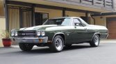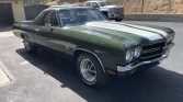 Work on this 1970 Chevrolet El Camino including a repaint in green with white stripes and the installation of a replacement 402ci V8 paired with a four-speed manual transmission. The suspension and brakes were overhauled, the interior was re-trimmed in black, and bucket seats from a late-model Camaro SS were installed according to the seller. Equipment includes a cowl hood, 15″ American Racing VN501 wheels, front disc brakes, a Weiand intake manifold, and a Holley four-barrel carburetor.