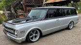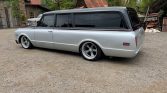This 1970 Chevrolet Suburban is a three-door example that was refurbished and modified some time prior to its recent acquisition by the current owner. Finished in metallic silver with a black upper section and red pinstripe over a gray and black interior, the truck is powered by a 468ci V8 paired with a Turbo-Hydramatic three-speed automatic transmission. Additional features include air ride suspension, a push-button AM radio, power-adjustable seats, electric windows, staggered-width 20” American Racing wheels, and a hidden rear receiver hitch.
