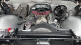 The 468ci V8 features brushed Holley Sniper-branded valve covers and is topped by a single Edelbrock carburetor mounted on an Edelbrock Performer 2.0 intake manifold.