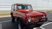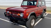 This 1970 Ford Bronco was refurbished and modified by Duffy’s Classic Cars in Iowa and its power is provided by a replacement 302ci V8 linked with a three-speed automatic transmission, a dual-range transfer case, and a limited-slip rear differential, and the truck is finished in burnt orange with a silver removable hardtop. Equipment includes Edelbrock Pro-Flo fuel injection, an aluminum radiator, 15″ alloy wheels, a suspension lift kit, Warn manually locking front hubs, power steering and brakes, and a custom-fabricated front bumper. On the inside, the bucket seats are upholstered in black leather and are joined by a Lecarra steering wheel, digital instrumentation, a Tuffy center console, and a heater.