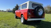 This 1970 International Harvester Scout 800A is a Traveltop 4×4 model that is finished in red with a white roof, and power comes from a 304ci V8 paired with a three-speed manual transmission and a dual-range transfer case. Equipment includes front bucket seats, front and rear lap belts, and aftermarket 15″ wheels with 31″ tires.