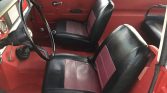 The cabin features front bucket seats and a rear bench trimmed in black upholstery with burgundy inserts. The floors have been sprayed with red bedliner material, and additional equipment includes a heater and front and rear lap belts.