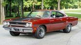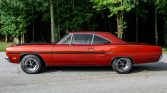 This 1970 Plymouth GTX hardtop is finished in Burnt Orange over black and powered by a replacement 440ci V8 paired with a four-speed manual transmission and Dana 60 rear axle. Features include front bucket seats, fog lamps, hood pins, the A33 Track Pak option, an Air-Grabber hood, painted hood stripes, reflective vinyl side stripes, a Hurst Pistol-Grip Shifter with a wood knob, a dual exhaust system, and 15″ Magnum 500 wheels.