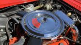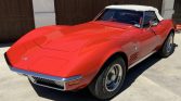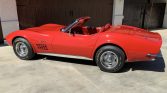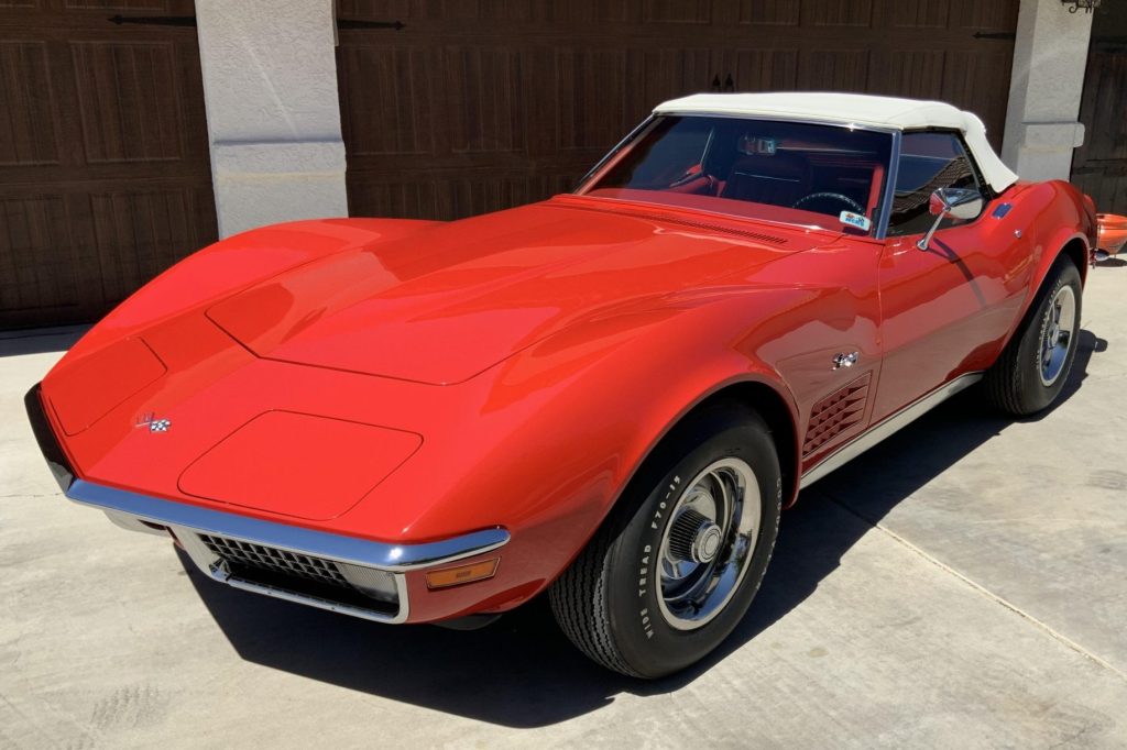 This 1971 Chevrolet Corvette convertible is finished in red over a matching vinyl interior and is powered by a numbers-matching 350ci V8 paired with a four-speed manual transmission and Positraction differential. Additional features include a Delco push-button AM/FM radio, pop-up headlights, power steering, and Rally wheels. The car underwent a body-off refurbishment during prior ownership and was recently acquired by the seller.