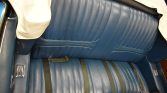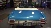 The car left the factory finished in Viking Blue (26) and is said to have been repainted during previous ownership. Features include a power-operated white soft top, a ram-air hood with white stripes and chrome twist locks, chrome bumpers with overriders, white side and decklid stripes, bright-finished trim, dual exhaust outlets, and “442” badging on the front grille, fenders, and decklid. Crazing is noted in the finish on the rear of the car, and additional work performed during current ownership is said to have included refinishing the driver-side rocker and reupholstering the soft top.