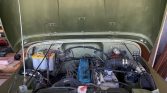 A replacement Ford T18 four-speed manual transmission features a 6:1 first gear ratio and powers the rear or all four wheels through a dual-range transfer case. Service in 2020 included replacing the clutch assembly, lubricating the chassis, repacking the wheel bearings, and changing the transfer case and transmission fluids. A frame cross-member is said to have been repaired in the fall of 2020, and rust is noted on some of the underside components as well as the engine firewall.