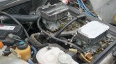 The 3.0-liter M30 inline-six is fitted with a black-finished valve cover. Service performed during the 2000s refurbishment reportedly included the installation of a polished street camshaft, a Unilite distributor assembly, an MSD ignition box, a rev limiter, a fan clutch, and engine mounts. Dual Weber 32/36 carburetors were installed under current ownership along with valve cover and oil pan gaskets, a crankshaft seal, spark plugs, wires, carburetor linkages, and a coolant expansion tank.