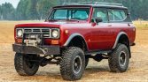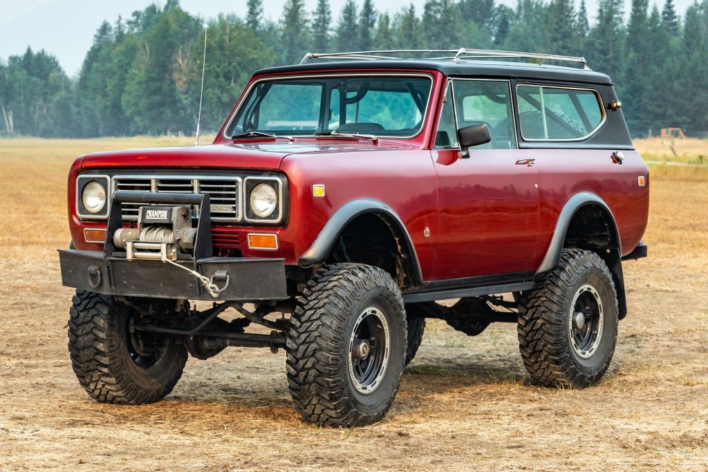 …This 1975 International Harvester Scout II was modified by its previous owner and is powered by a replacement 392ci V8 mated to a three-speed automatic transmission and a two-speed transfer case. Following the seller’s acquisition in 2020, the truck was refinished in metallic red over a black and gray interior. Additional equipment includes a removable hardtop, fender flares, a spring-over-axle suspension lift, a six-point roll cage, ARB Air Lockers, 17″ Incubus wheels, and front disc brakes.