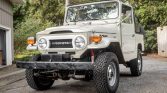This 1975 Toyota Land Cruiser FJ40 is finished in beige over a gray vinyl interior and is powered by a carbureted 4.2-liter 2F inline-six paired with a four-speed manual transmission and a dual-range transfer case. Additional features include a black vinyl bikini top, a lockable front storage box, a Kenwood head unit, Warn manually-locking front hubs, and Rancho RS9000 shocks. The truck was reportedly refurbished in 2012, and an oil change was carried out earlier in 2021.