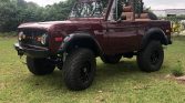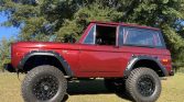 This 1976 Ford Bronco was acquired by the seller in 2019 and subsequently underwent a cosmetic and mechanical refurbishment that included repairing and refinishing the body and modifying the suspension and brakes. The truck is finished in dark red over tan leather upholstery and is powered by a 302ci V8 paired with a three-speed automatic transmission and a dual-range transfer case. Features include a body-color removable hardtop, a roll bar, four-wheel disc brakes, a suspension lift kit,…