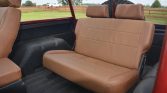 The cabin features Procar seats upholstered in tan leather with a matching dash pad, door panels, and visors. Amenities include spray-on bedliner-coated floors, a body-color Krawler’s Edge roll cage with sunshades, a locking center console equipped with phone chargers, and a JL Audio stereo with a jerrycan-mounted subwoofer in the cargo area.