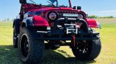 The truck was repainted red metallic and fitted with “Intimidator” decals in approximately 2020 and features a black bikini top, a roll bar, a Smittybilt XRC 9,500-lb winch, a Hi-Lift jack, dual side mirrors, and an LED lightbar, pod lights, and headlights. Diamond plate trim covers the rocker panels and rear corners, and a Rhino Linings textured coating has been applied to the double tube bumpers, wheel arch flares, and iArmor side steps.