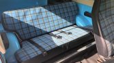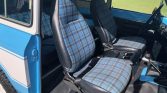 The cabin features front bucket seats and a rear bench that have been reupholstered in black vinyl with plaid fabric centers along with a black dashboard, door panels, and rubber floor mats. Dynamat sound deadening material has reportedly been added by the seller, and amenities include an under-dash air conditioner, a Kenwood AM/FM cassette stereo, and a center console with cupholders.