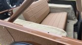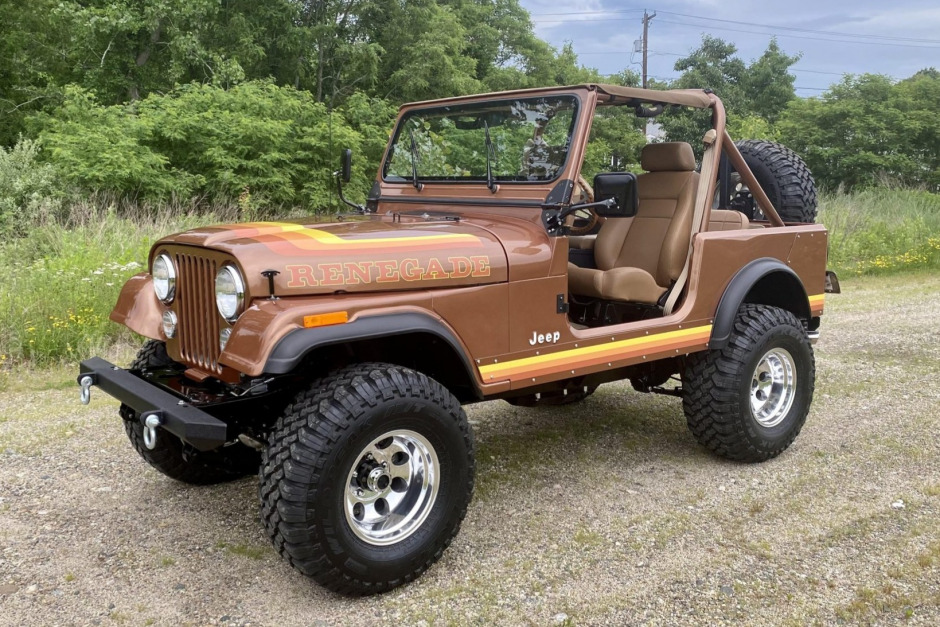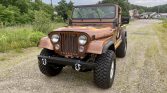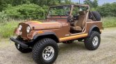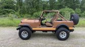 This 1979 Jeep CJ-7 was acquired by the seller in 2020 and has since been refurbished and modified. Work included retrofitting a Wrangler YJ tub to the CJ frame, along with a repaint in brown, replacement graphics, refreshment of the brakes, and the installation of a Chevrolet 350ci V8 and a TH400 three-speed automatic transmission. Additional equipment includes a dual-range transfer case, an Edelbrock intake manifold, a Holley carburetor, a Flowmaster exhaust, a 2.5” suspension lift and 1″ body lift, 15” Pro Comp wheels with 33″ tires, Smittybilt seats, a swing-out rear spare carrier, and a tan bikini top.