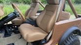 A YJ tub was reportedly fitted to the CJ frame during the refurbishment, sheet metal repairs were performed, and the body was repainted brown and fitted with replacement graphics sourced from Phoenix Graphix. The exterior seals, mirrors, windshield, and wipers are said to have been replaced at that time, and additional features include a tan canvas bikini top attached to the roll bar, a swing-away spare tire carrier, black wheel arch extensions, aftermarket black-finished bumpers, and twin exhaust outlets.