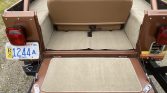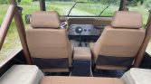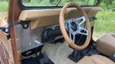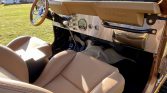 The cabin houses bolstered Smittybilt front seats with a rear bench trimmed in tan vinyl along with a matching dash pad and beige carpeting. Additional features include rubber floor mats, a locking center console, a glove compartment, and a Lokar shifter.