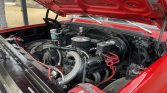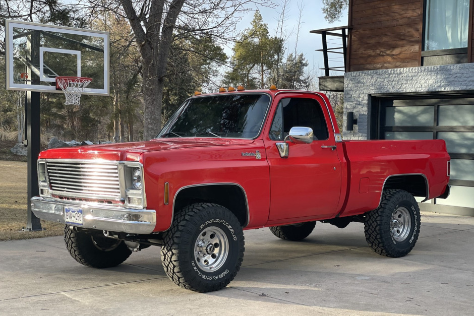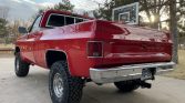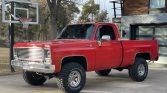 This 1980 Chevrolet K10 Scottsdale is a short-bed Fleetside pickup that is powered by a replacement 350ci V8 paired with a three-speed automatic transmission and a two-speed transfer case. The truck is finished in red over charcoal cloth, and features include 15″ aftermarket alloy wheels, locking Warn front hubs, tinted windows, lifted suspension, a rear towing hitch, a dual exhaust system with Flowmaster mufflers, an aftermarket stereo, and Dakota Digital instrumentation.