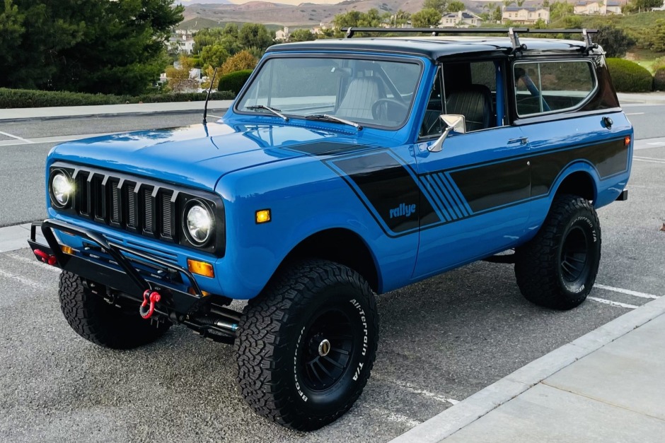 This 1980 International Harvester Scout II 4×4 is finished in blue with black accents over a black vinyl-trimmed interior and it is powered by a 345ci V8 paired with a three-speed automatic transmission and a dual-range transfer case. Features include a gloss-black removable hardtop, an aftermarket grille, Warn manually locking front hubs, Bilstein shocks, an Edelbrock carburetor, a heater, sliding rear windows, and a Kenwood CD stereo with Bluetooth connectivity and Kenwood speakers.