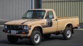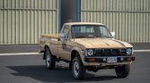 This 1980 Toyota pickup is a long-bed model that was sold new by Mid-Valley Toyota in Marysville, California, and was acquired by the current owner in 2019. The truck is finished in beige with tri-color aLents over a tan interior and is powered by a carbureted 2.2-liter inline-four paired with a four-speed manual transmission and a dual-range transfer case. Additional features include 15″ wheels, a sliding rear window, and an AM/FM radio.
