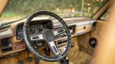 The cabin is upholstered in tan and the bench seat has been retrimmed in textured cloth. Amenities include a sliding rear window, a map pocket, and an AM/FM radio. Both the horn and the ammeter are broken.