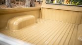 The truck is finished in beige with three-color graphics on the doors, front fenders, and hood. The rear bumper has an integrated ball hitch, and aftermarket lights have been fitted to the front bumper. The bed and rails have reportedly been refinished.