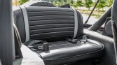 The cabin features front bucket seats and a rear bench that have been reupholstered in black vinyl with gray accents. Equipment includes an aftermarket Axxera CD stereo, a heater, and Jeep-branded rubber floor mats.