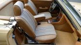 Tan upholstery with patterned cloth inserts covers the seats and center armrest, and refurbished burl walnut veneer trim accents the dashboard, center stack, and console. Amenities include power windows, a Becker radio, and air conditioning. The seller states that the climate control panel was rebuilt and the floor mats have been replaced.
