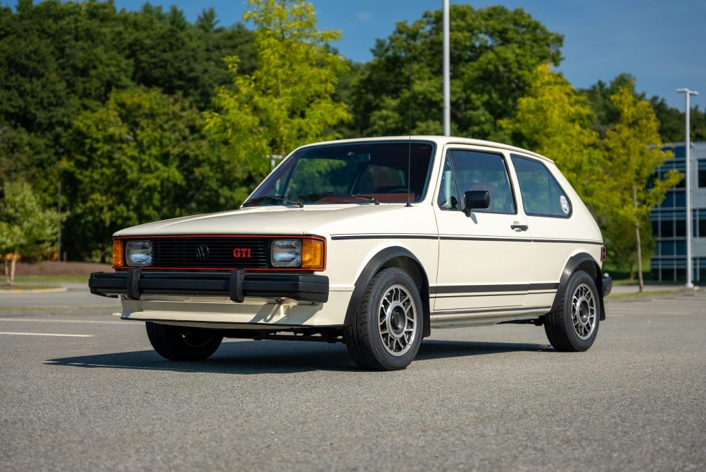 This 1983 Volkswagen Rabbit GTI was first delivered to Riverside Volkswagen of Gallipolis, Ohio, in December 1982 and the 1.8-liter inline-four was subsequently fitted with a Stage II turbocharger system by Callaway Turbosystems of Old Lyme, Connecticut, in August 1983. Additional equipment includes a five-speed manual transaxle, 14” alloy wheels, black impact bumpers, and a rear window wiper. The car is finished in Cashmere White over red velour upholstery.