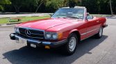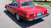 This 1985 Mercedes-Benz 380SL is finished in Signal Red over Palomino leather and is powered by a 3.8-liter M116 V8 paired with a four-speed automatic transmission. Equipment includes a removable body-color hardtop, a black soft top, 14″ forged alloy wheels, anti-lock disc brakes, power windows, cruise control, and a Becker Grand Prix cassette stereo. The car was originally delivered to Haun Motors of Bluefield, West Virginia, and later spent time in Virginia, North Carolina, and Florida before the seller acquired it in early 2021. Subsequent service included replacement of the timing chain, guide rails, and tensioner as well as the radiator, accessory belts, shift linkage bushings, and valve cover gaskets.