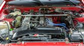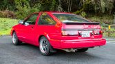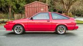 This 1985 Toyota Corolla GT-S is powered by a 1.6-liter DOHC inline-four paired with a five-speed manual transmission, and it is finished in red over two-tone red and gray cloth upholstery. Features include coilover suspension, 15″ Volk Racing wheels, pop-up headlights, GT-S-specific spoilers, and a Pioneer touchscreen stereo. Work included an exterior repaint, a re-trim of the cabin, and replacement of the wheels, tires, suspension, tie rods, and audio system.