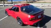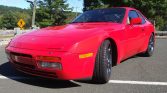 This 1986 Porsche 944 Turbo is powered by a turbocharged 2.5-liter inline-four paired with a five-speed manual transaxle and is finished in red over gray upholstery. Equipment includes a power-operated removable sunroof panel, a Blaupunkt cassette stereo, and bodyside moldings, while modifications include 18” Turbo Twist wheels, a hybrid Porsche/Huntley Racing ball-bearing turbocharger, a Huntley Racing exhaust system with a carbon-fiber muffler, and Rennline Turbo-script door sill guards.