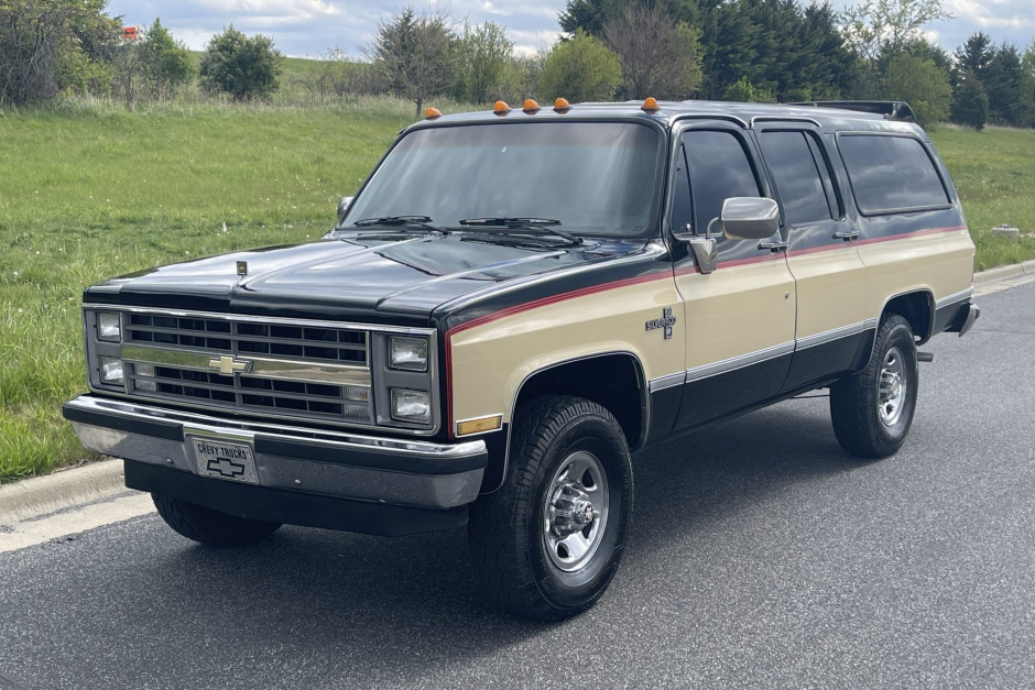 This 1987 Chevrolet Suburban 2500 Silverado 4×4 is finished in black and pale yellow over tan vinyl, and power is from a fuel-injected 350ci V8 paired with a four-speed automatic transmission and a dual-range transfer case. Equipment includes 16″ chrome-finished wheels, air conditioning, power steering, cruise control, upgraded audio, and power windows and locks. The truck was first registered in Tennessee and remained there until its acquisition in 2021 by the selling dealer. This Suburban 2500 is now offered in Wisconsin with a clean Carfax report and a clean Tennessee title.